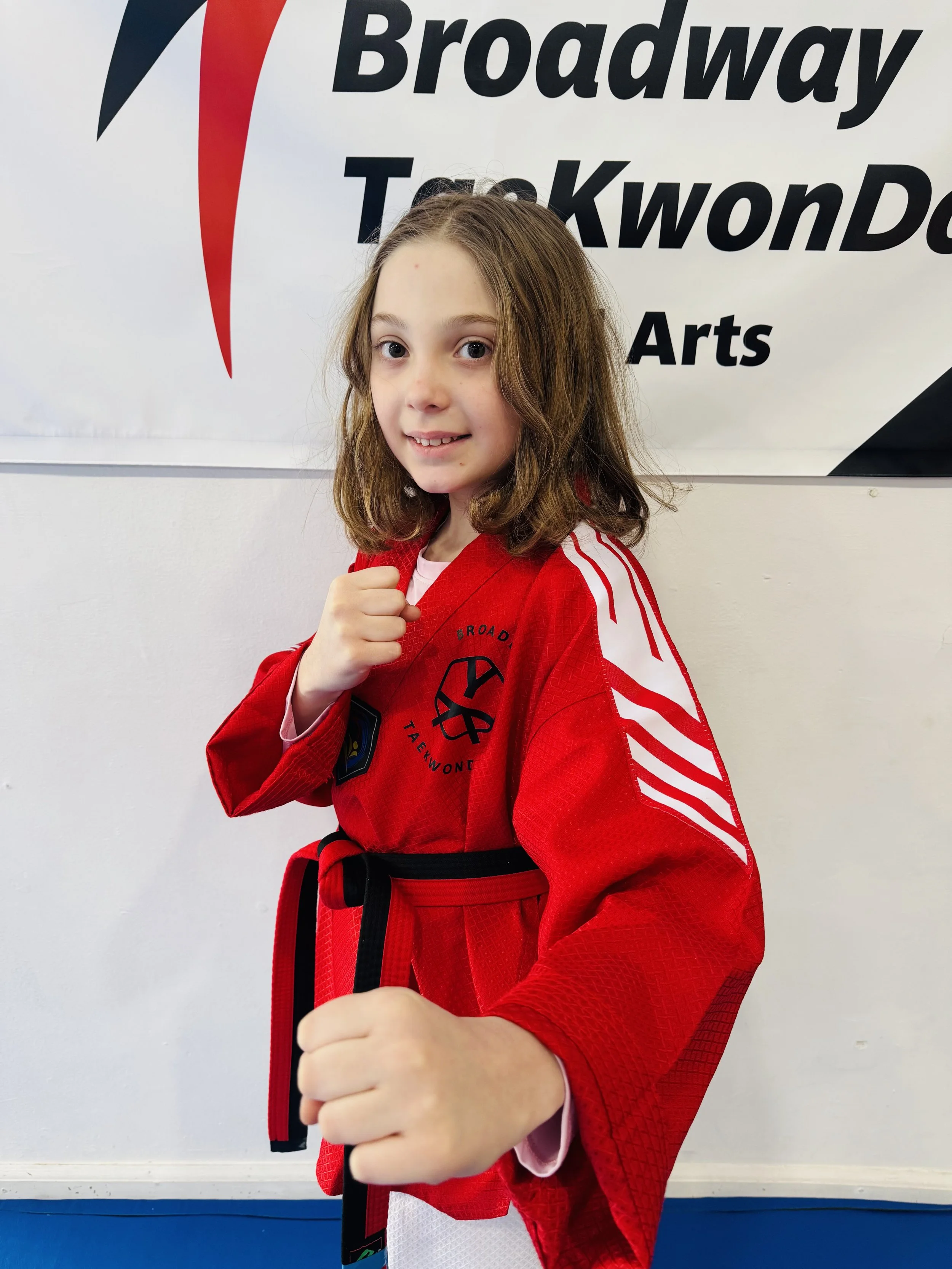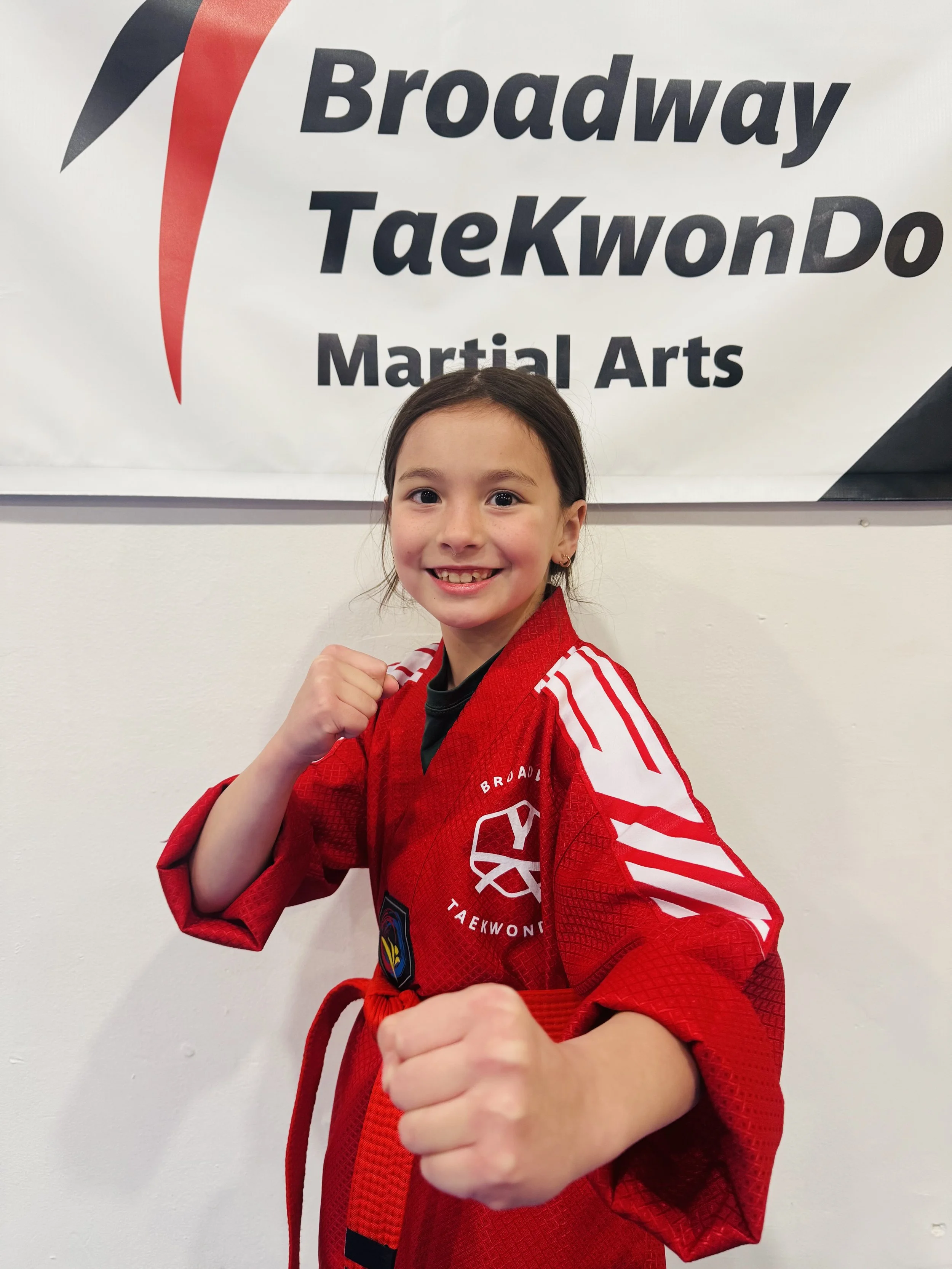 Hi! My name is Ella. I started Taekwondo at Broadway Taekwondo in 2022. In 2025, I earned my poom belt, and now I’m training hard for my next goal — the black belt!
