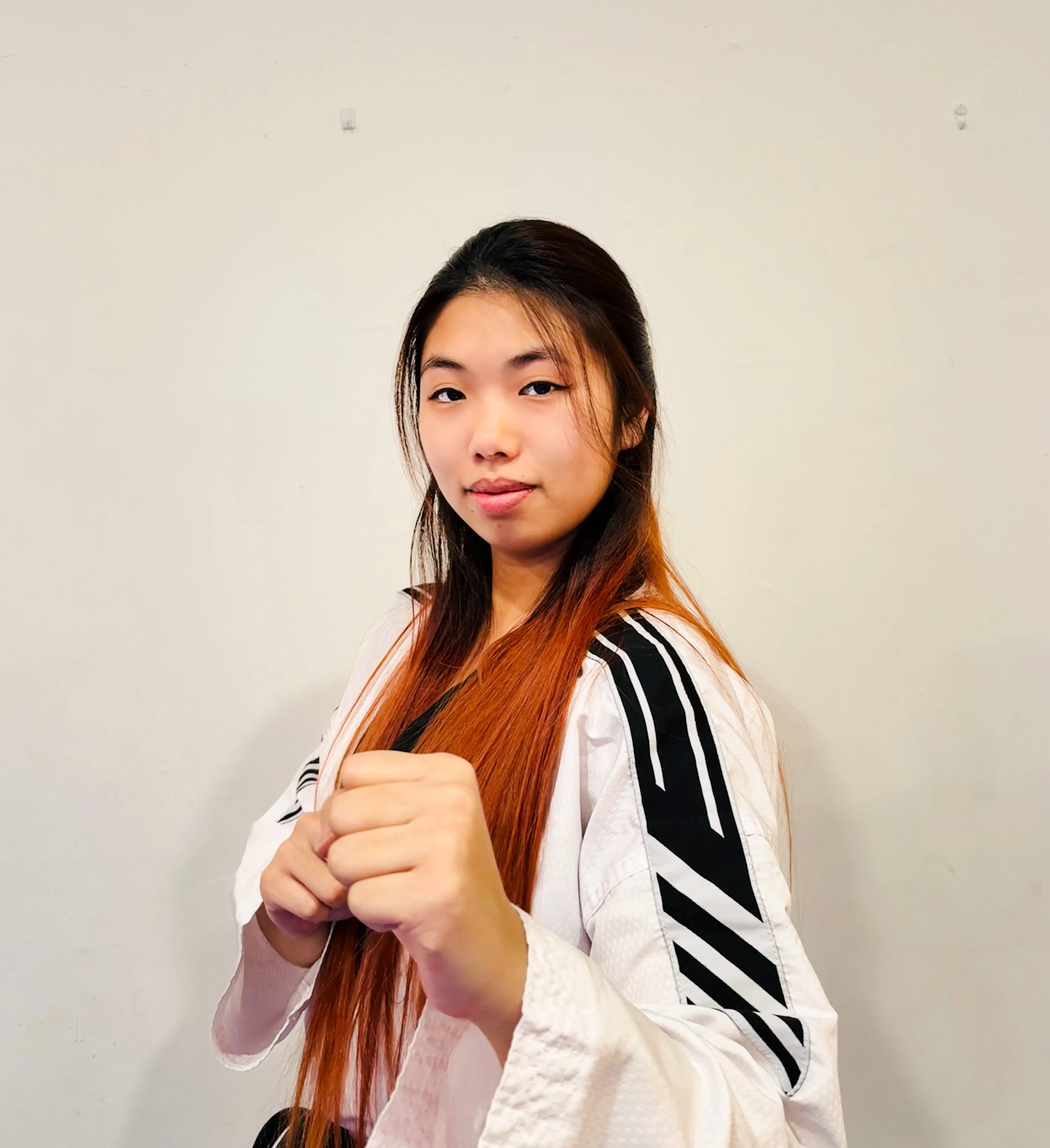 Hi! My name is Abigail, but you can call me Abby. I’m from the Upper West Side of New York City. I started Taekwondo in 2022, and I earned my poom belt in 2024. In 2025, I became a junior assistant, which has been so much fun!